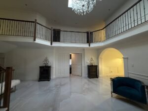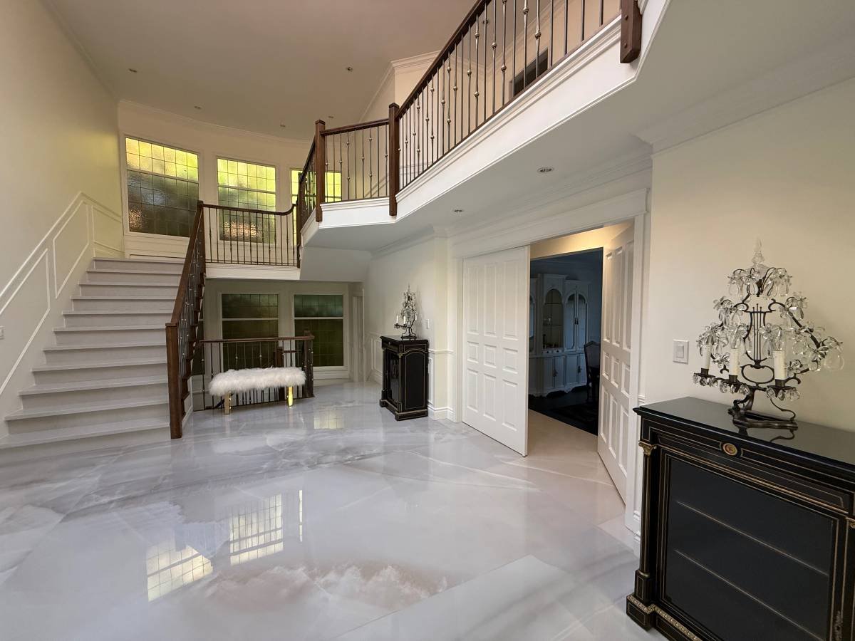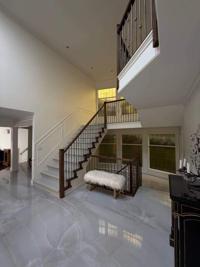 The main level offers an elegant entryway with marble floors throughout. The bright kitchen overlooks the serene yard, pool and backyard creek. Leave the doors open to hear the sound of the water. A large spice kitchen and family room can be found off of the kitchen. A dining room with space for 12 leads into a grand foyer and large living area, piano, cigar room and powder room.